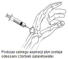 • Aspiracja. Jeżeli ganglion wywołuje ból lub ogranicza aktywność, płyn może zostać odessany z torbieli. Zabieg ten nosi nazwę aspiracji. W naszej placówce medycznej wykonywany jest zawsze pod kontrolą USG, w celu zapewnienia precyzji. Obszar wokół torbieli zostaje znieczulony i torbiel jest nakłuwana za pomocą igły, tak żeby umożliwić usunięcie płynu. Aspiracja często nie usuwa ganglionu, ponieważ jego ‘korzeń’, czyli połączenie ze stawem lub pochewką ścięgnistą nie zostaje usunięty. Ganglion, podobnie jak chwast, odrośnie, jeśli nie usunie się jego korzenia. W wielu przypadkach torbiel nawraca po wykonaniu zabiegu aspiracji. Zabieg aspiracji najczęściej jest zalecany w przypadku ganglionów zlokalizowanych na grzbiecie nadgarstka.