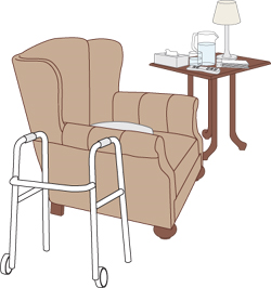 Przedmioty, których często używasz (np. telefon, pilot, radio, chusteczki higieniczne, kosz na śmieci, dzbanek i szklanka, gazety i leki) umieść w zasięgu ręki, żebyś nie musiał daleko po nie sięgać lub się schylać.